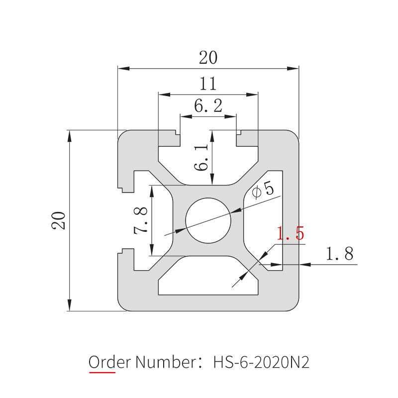 The 2020N2 aluminum profile is the double-sided closed slot model of the 20 series. Based on the standard 2020, two adjacent slot openings are closed while retaining the mounting slots on the other two sides, with a cross-sectional dimension of 20×20mm and a 6mm slot width. The body is made of 6063-T5 aluminum alloy with anodized surface treatment. The closed faces are smooth and slot-free, mainly used for structural connections in the middle sections of frames. After assembly, the inner and outer surfaces of the frame are smooth and groove-free, making cleaning easier while enhancing the overall visual appearance. Suitable for equipment enclosures, operation tables, and display racks with high requirements for aesthetics and cleanliness.