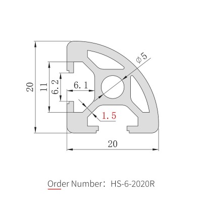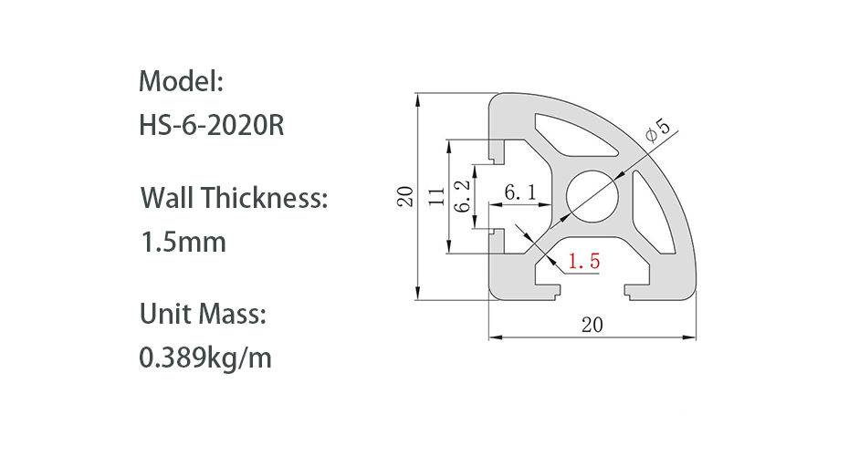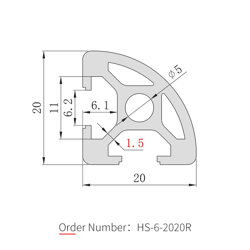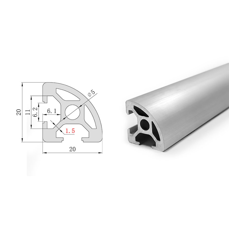 The 2020R arc aluminum profile is a special model in the 20 series. Based on the standard 2020, one right angle is replaced with a rounded arc chamfer design. The body is made of 6063-T5 aluminum alloy with anodized surface treatment. The rounded arc surface has no sharp edges, and is mainly used for the outer edges and columns of aluminum profile frames, effectively preventing personnel injuries from accidental contact, improving equipment safety levels, and giving the frame a smoother and more aesthetically pleasing appearance.