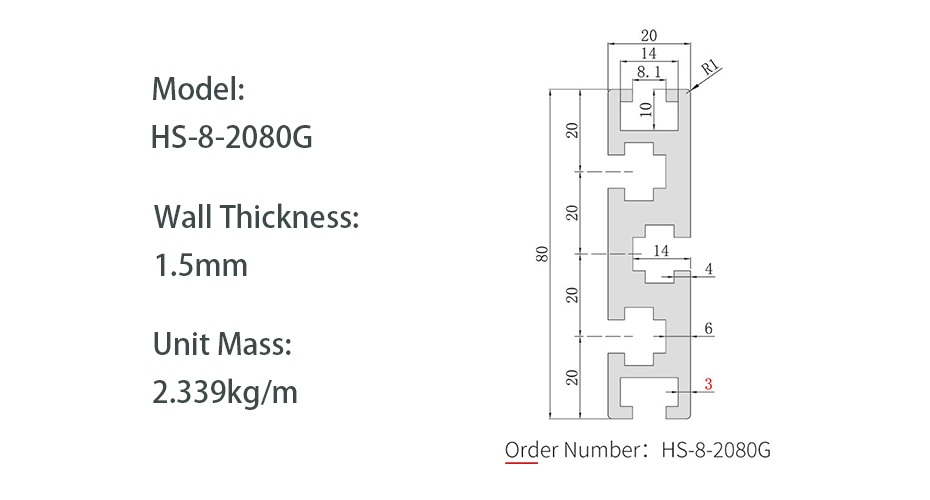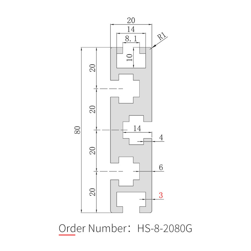The 2080 aluminum profile is the heavy-load model of the 20 series, with dimensions of 20×80mm and an 8mm slot width, belonging to the national standard square slot system. The body is made of 6063-T5 aluminum alloy with anodized surface treatment. The 80mm face features a single-slot design on one side and a double-slot design on the other, which is notably different from the four-slot design on both sides of T-slot aluminum profiles. Compatible with M8/M6 square nuts with 14mm opposite sides and national standard 14F series T-nuts and bolts. Commonly used for manufacturing frames and bases of small CNC engraving machines, marking machines, individual cutting machines, grinding machines, and similar equipment. The wide face can serve as a stable sliding rail worktop, ensuring equipment operating precision.