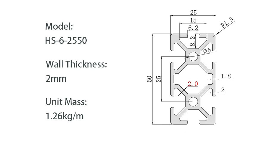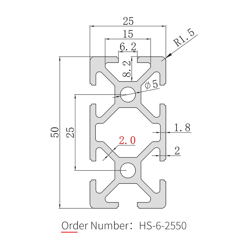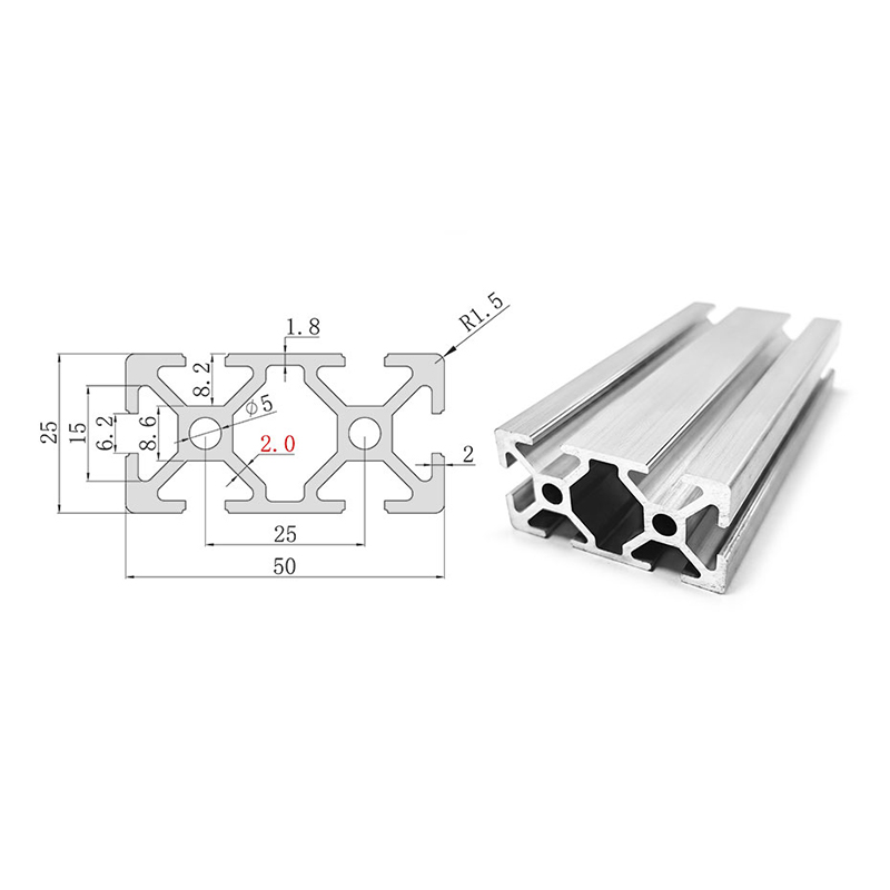 The 2550 aluminum profile is the rectangular cross-section model of the 25 series, with dimensions of 25×50mm and an available slot width of 6mm. The body is made of 6063-T5 aluminum alloy with anodized surface treatment, offering a bright silver finish with strong corrosion resistance. Commonly used for automated assembly line frames, medium-sized equipment bases, workbench supports, mechanical protective barriers, and conveyor line brackets, making it an ideal choice in the 25 series that balances rigidity and lightweight design.